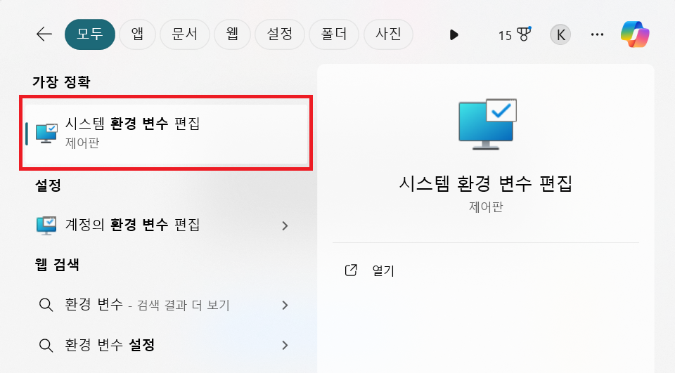 [환경 변수]를 검색해서 [시스템 환경 변수 편집] 화면에 들어간다.