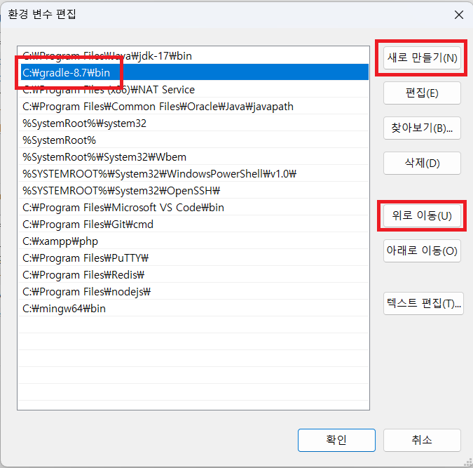 [새로 만들기]를 클릭한 후에, 앞서 압축을 해제한 gradle-8.7 폴더에서 bin 폴더의 경로를 찾아 입력해준다.